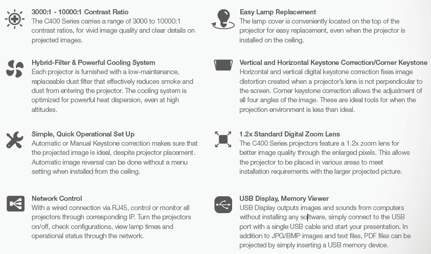 Other Features | 1. One Touch Lens Replacement 2. Quick Power Off 3. Customized Startup Logo 4. Auto Image Reverse 5. Build in Test Images 6. One Touch Blank Screen 7. Closed Caption 8. Image Zoom in/out 9. Image Freezing, Zoom and Panning 10. Top Cover Lamp Replacement 11. Anti-theft bar & Lock |